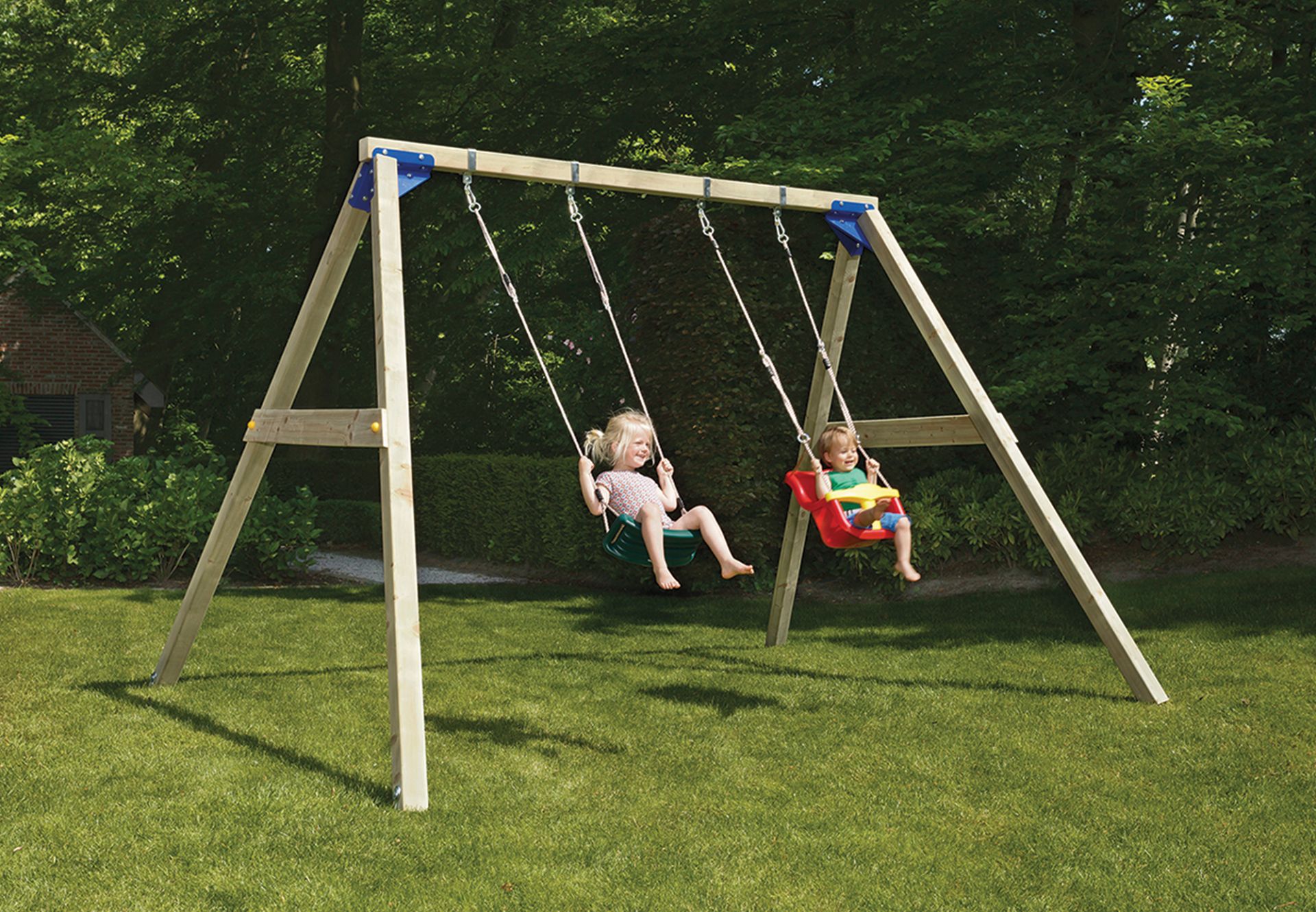 Inbegrepen: Bouwtekening, 4 grondankers, 4 schommelhaken, bevestigingsmaterialen en houtpakket met staanders 8.8x8.8cm Exclusief speelgarnituren.