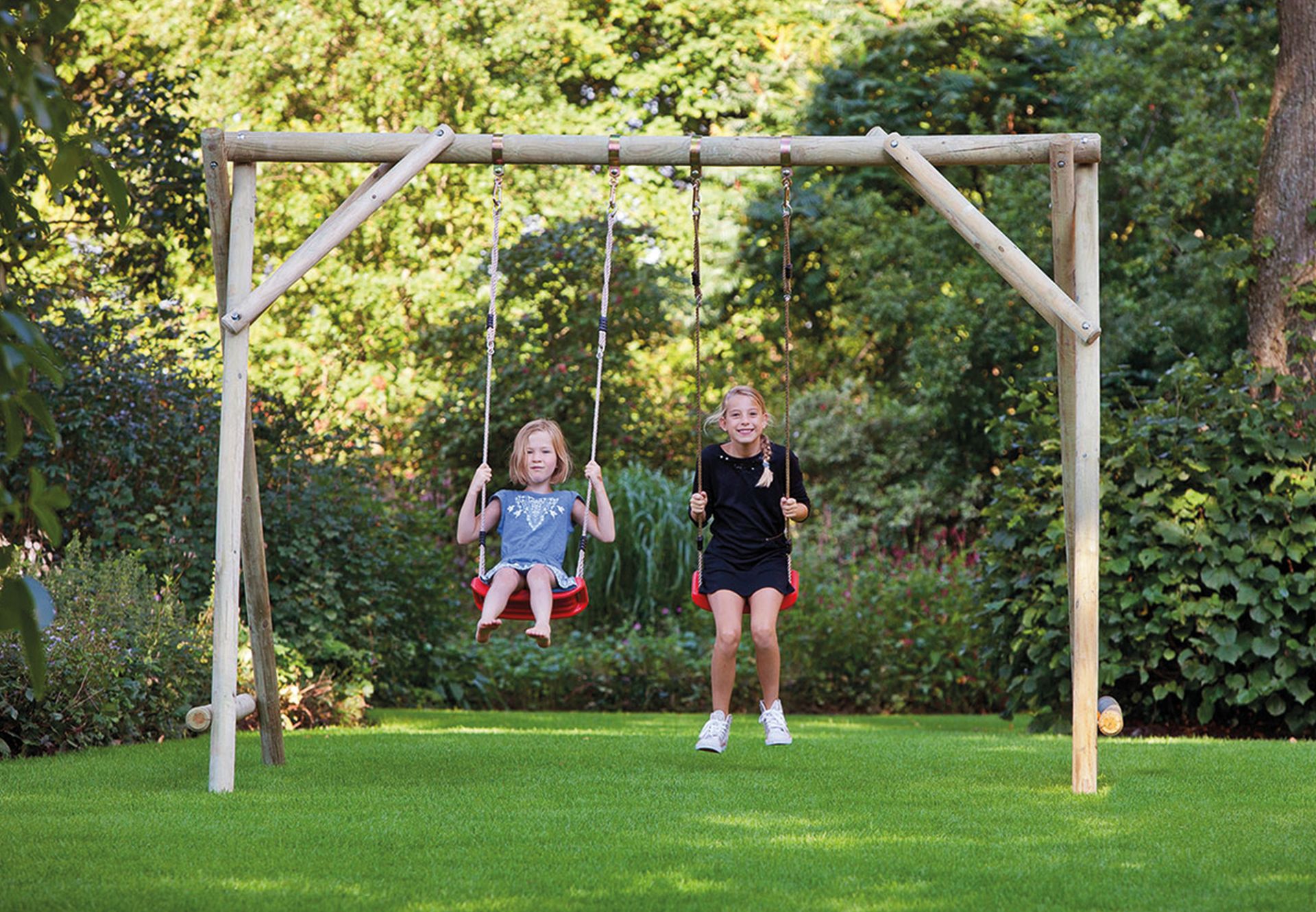 Inbegrepen: Schommelbalk ø10cm bevestigingsmaterialen, 4 grondankers, 4 schommelhaken en 2 kunststof schommels. Diameter hout: ø9-10cm - Afmeting: L300xB230xH225cm.
